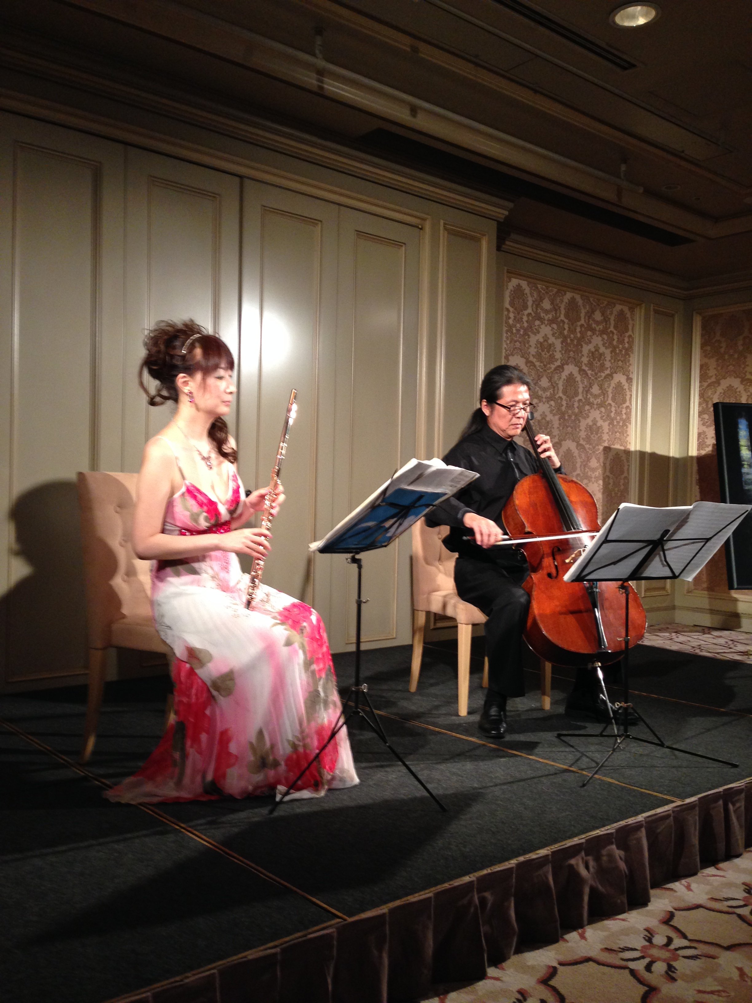 高音域の美しいフルートと低音が豊かで伸びやか、幅のあるチェロとの組み合わせはバロック音楽や現代音楽でニーズがあります。写真は東京・椿山荘にて